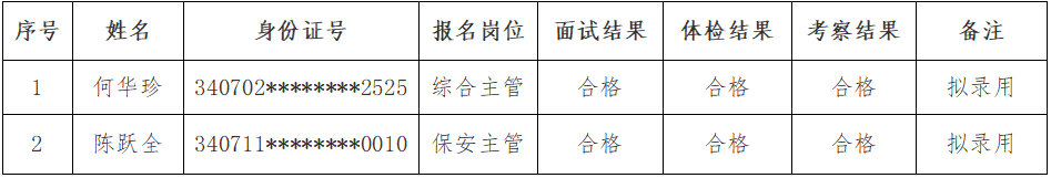 ? 根據(jù)《銅陵保祥城市服務(wù)有限公司招聘工作人員公告》規(guī)定,經(jīng)過(guò)報(bào)名、面試、體檢、考察等環(huán)節(jié),現(xiàn)將擬錄用人員公示如下(見(jiàn)附件)。